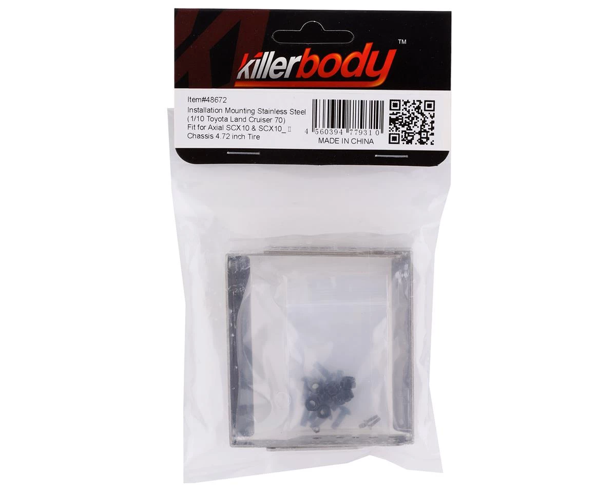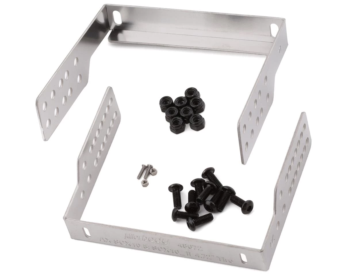 Killerbody Axial SCX10 II LC70 Stainless Steel Body Mounts. This optional mount set is used to mount the Killerbody LC70 Body Set (KLR-48601) to the Axial SCX10 and SCX10 II. Package includes two body mounts with hardware.