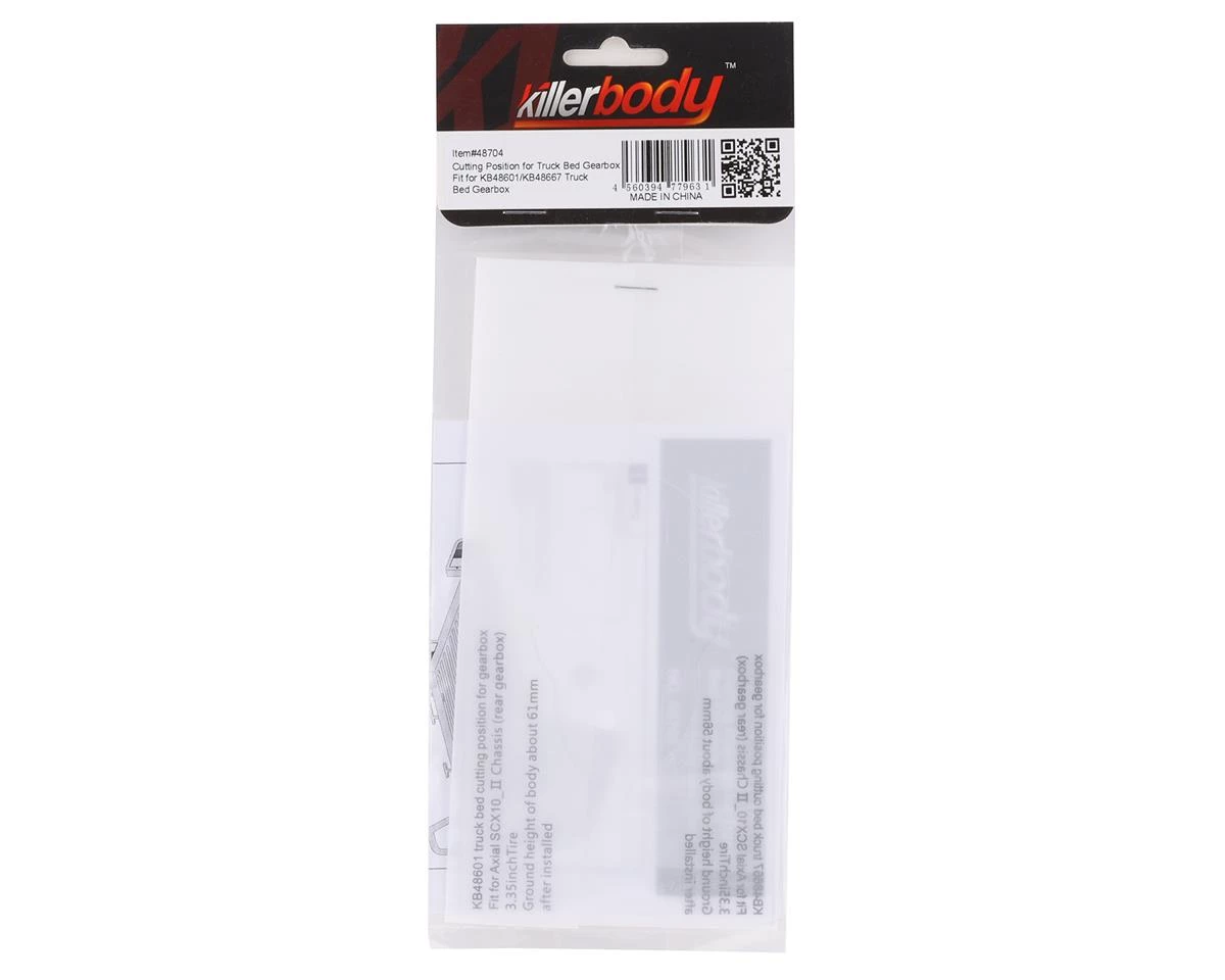 Killerbody Axial SCX10 II LC70 Truck Bed Gearbox Template. This optional template shows you exactly where you need to cut the Killerbody LC70 truck bed to fit over the Axial SCX10 II Gearbox. Package includes two templates.