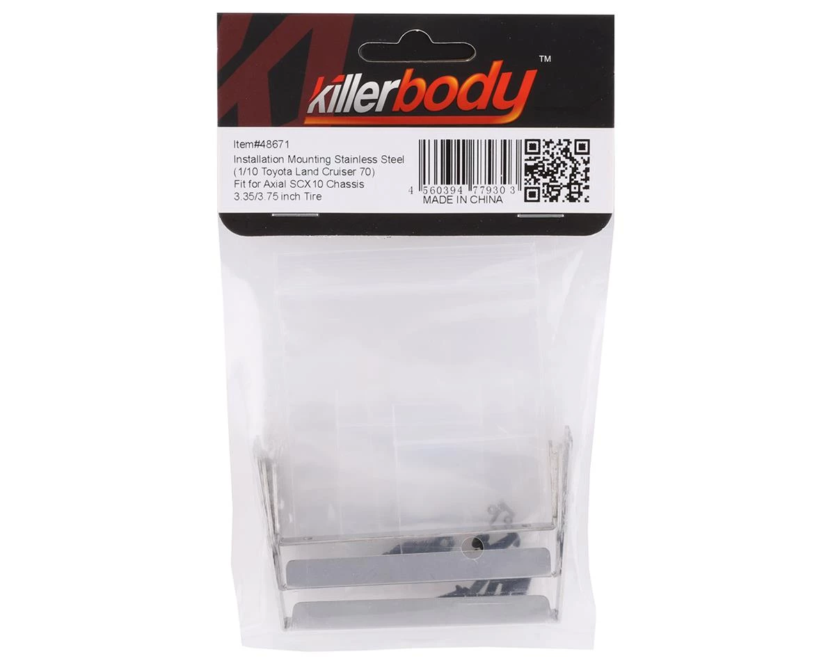Killerbody Axial SCX10 II Stainless Steel Body Mount Set. This body mount set is used with the Axial SCX10 II to mount the optional Killerbody LC70. Package includes three body mounts.