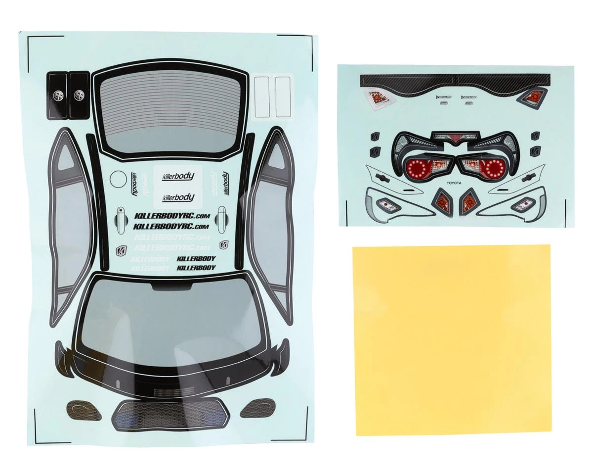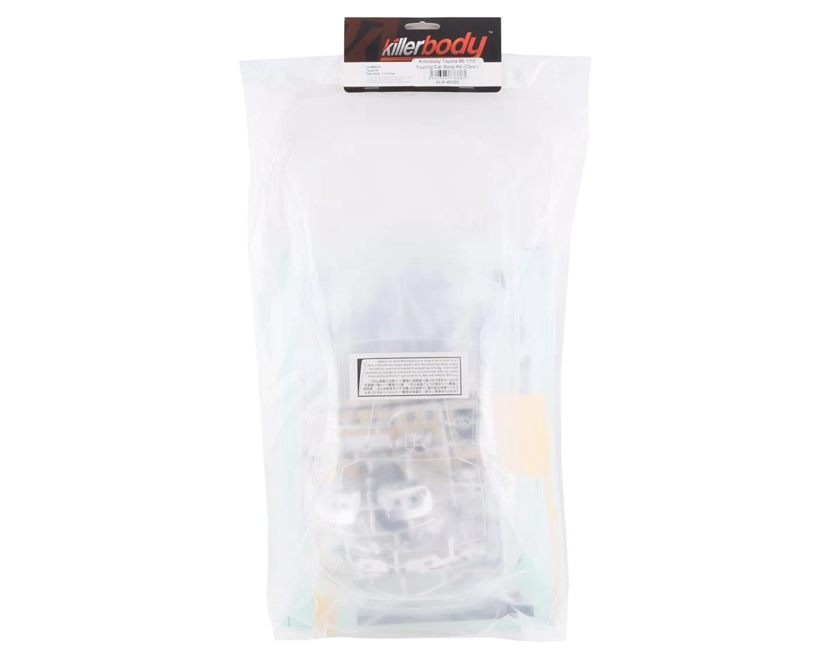 The Killerbody Toyota 86 1/10 Touring Car Body Kit is a great optional body intended for RC drift or touring car chassis with a 257mm wheelbase and 190-200mm width. Using a 200mm chassis will allow for a more “stanced” look, while the 190mm chassis will give a more tucked look. This body is clear and uses a separate piece front and rear bumper so that more fine detail can be added. Featuring many scale details including molded wiper blades, side mirrors, light buckets and exhaust tips. Package includes one clear body, two polycarbonate bumpers, two molded scale parts trays, two decal sheets, one window mask sheet and hardware.